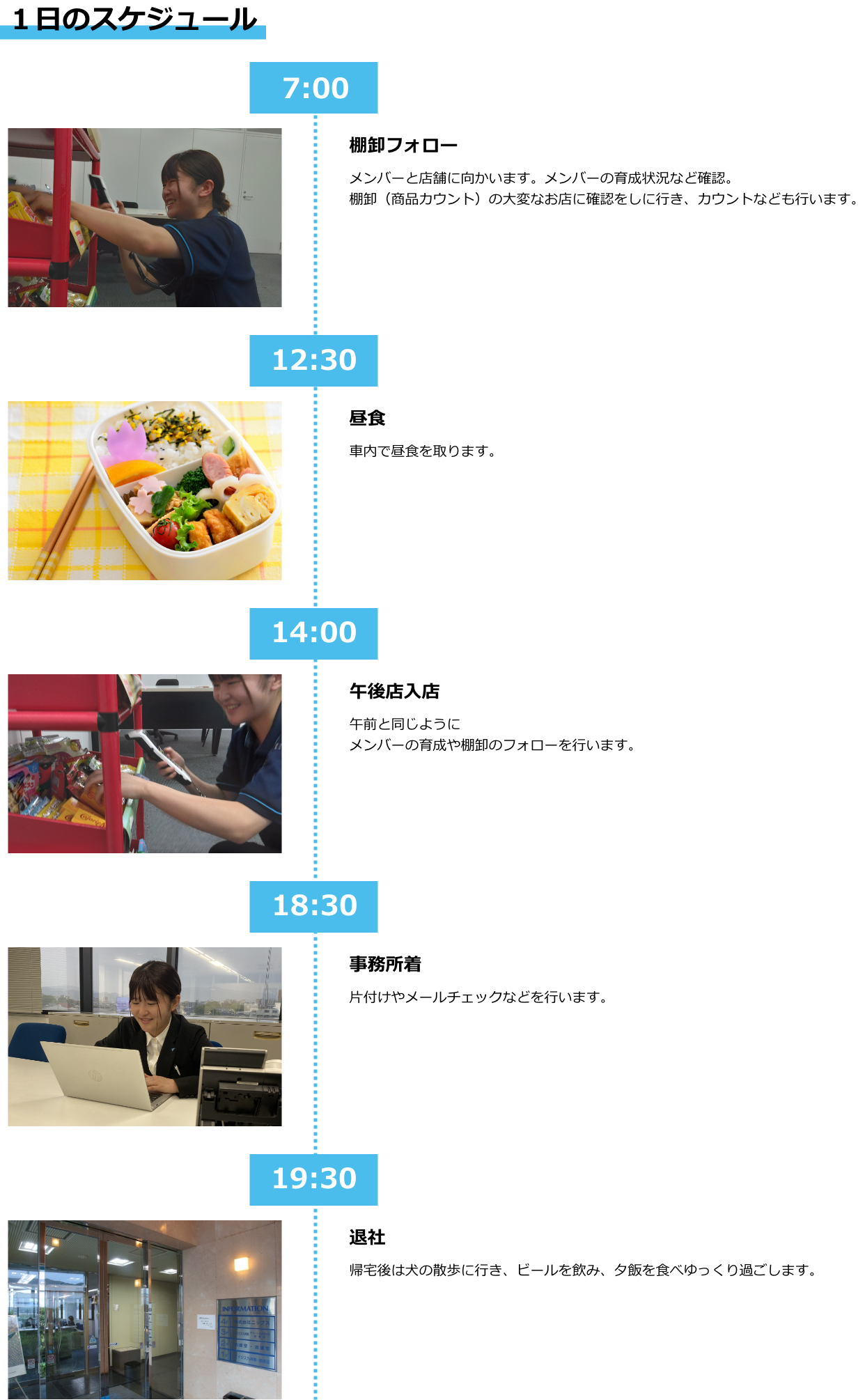 現在の仕事内容を教えて下さい。福岡県内のコンビニエンス各店舗にお伺いし、実地棚卸(商品カウント)のサービスを提供しています。お客様が管理している資産を確定するだけでなく、サービスの精度と生産性を日々チェックすることで最適化しています。また、実地現場でのヒアリングからオーナー様が今困っていることを発見しデータに基づいた改善策、サービスを提案しています。