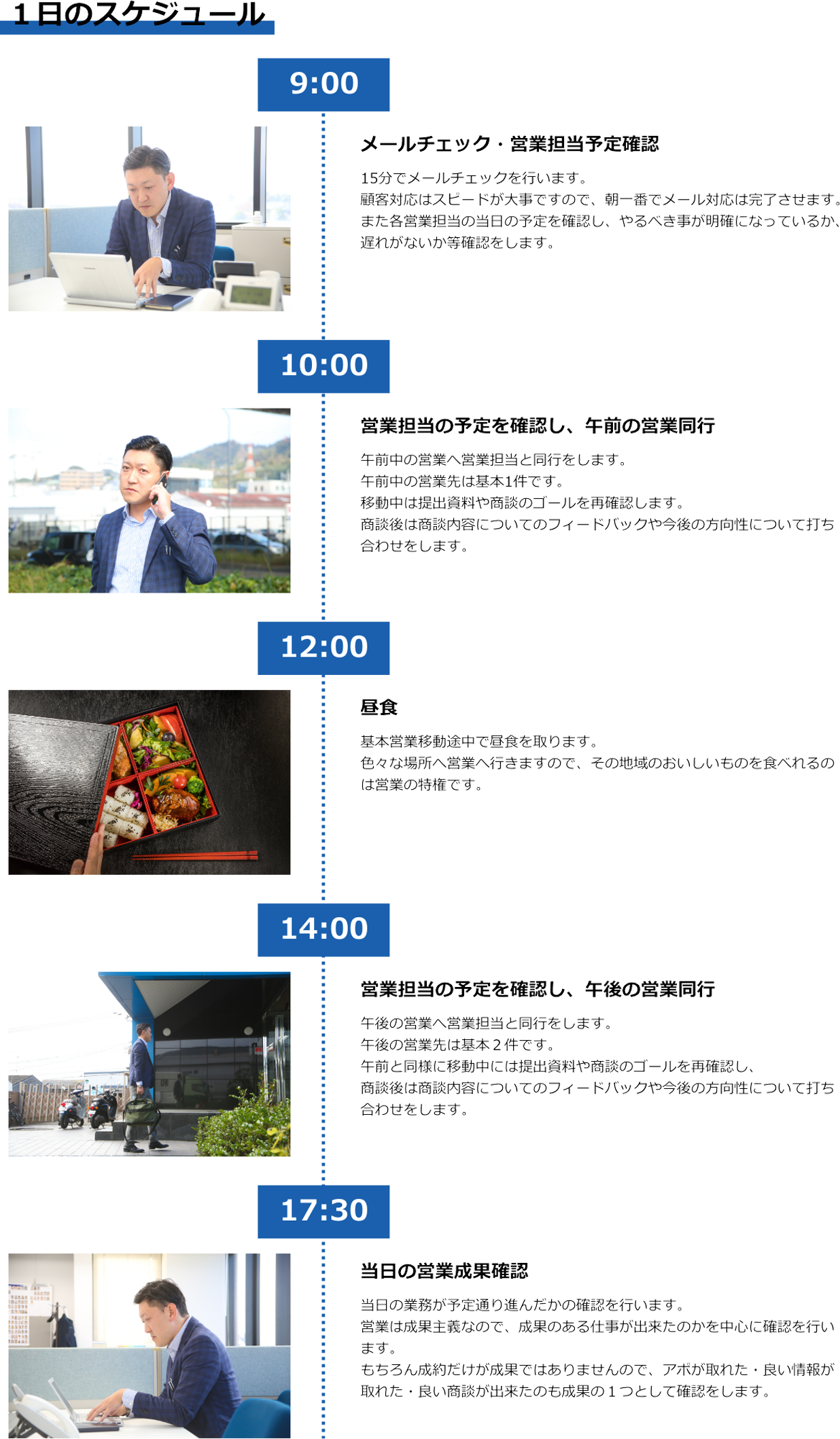 主に既存のお取引様とのミーティングです。内容はお取引様の抱えている課題のヒアリング及び解決提案となります。課題を明確にする必要がありますので、色々な方とミーティングを行うこともあります。各お取引様で抱えている課題も違いますので、課題を確認し、実態調査を行った上で、お取引様の課題を認識します。課題を解決する為に不足している部分をエイジスで補いますので、お取引様と協業し、課題を解決します。