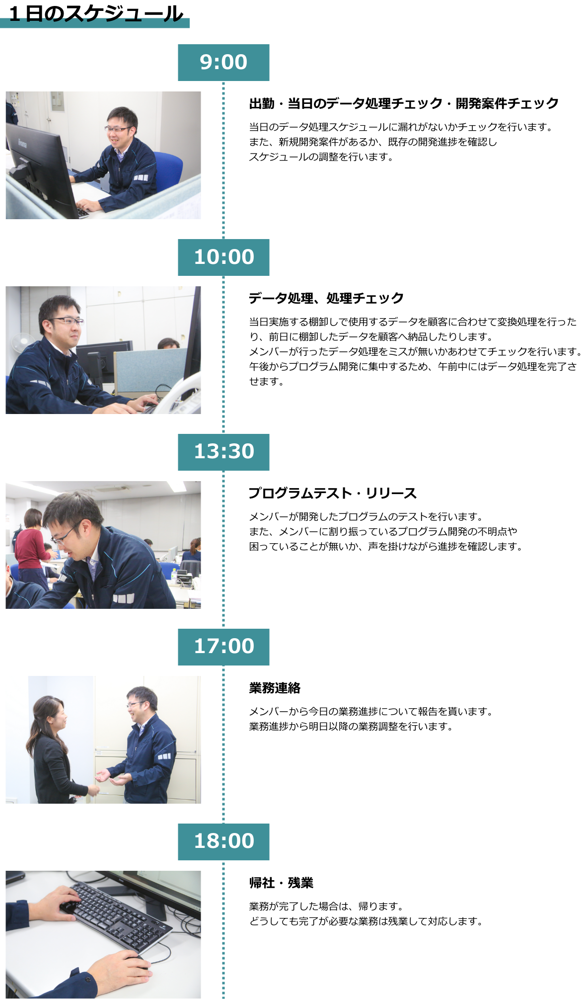 主な仕事内容は、棚卸システムの仕様を社内窓口と打ち合わせたり、時には客先へ伺い直接打ち合わせを行ったりします。決定した内容をプロジェクトリーダーとしてリリースまで管理を行います。また、日々稼動する棚卸で使用する顧客別の専用マスタの加工や、データ納品対応などが正しく行われているのかについても管理しています。その他に、次世代の棚卸システムの導入に向けエイジスグループでのミーティングへ参加し先を見据えた社内研修、教育を行っています。