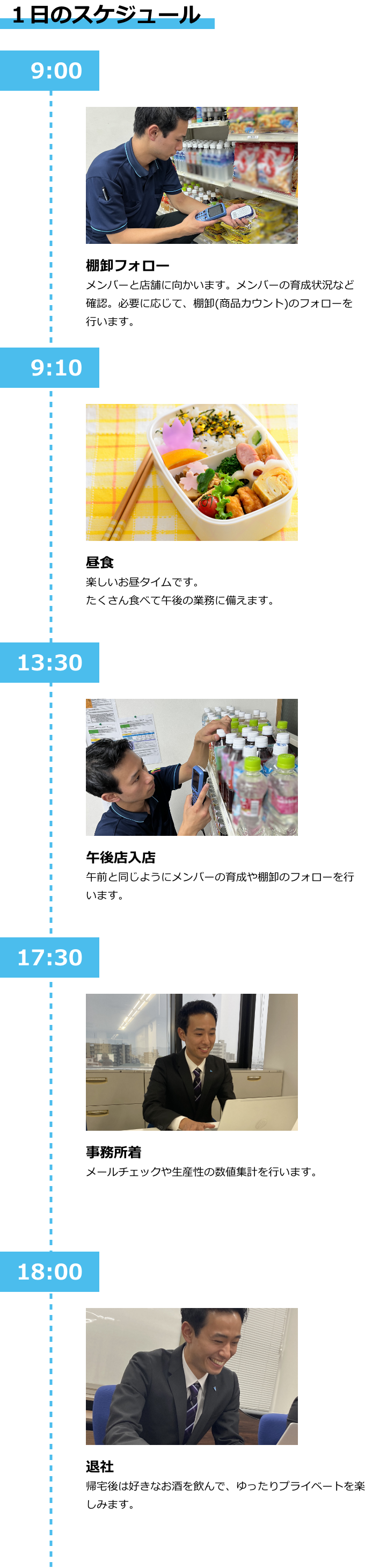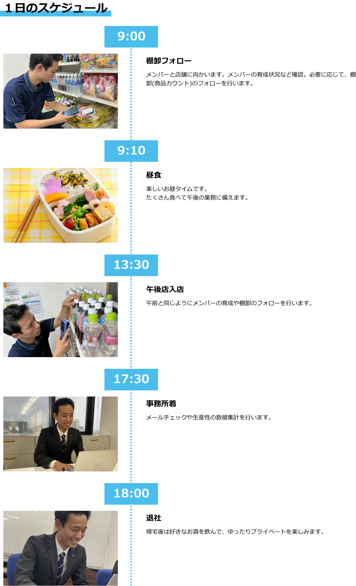 現在の仕事内容を教えて下さい。主な仕事内容は、実地棚卸を通してお客様に正確なデータ提供を行っています。実際に現場へ行き、立会者様と打ち合わせをしながら在庫を数え、棚卸高を確定します。日中の棚卸では基本的に1日に2店舗棚卸を行っています。営業中での作業となるため、来店されるお客様には気持ちよく買い物をしてもらうような配慮を心がけながら取り組んでいます。また、効率よくスムーズに進行できるよう日々稼働する棚卸でメンバーのスケジューリングも行っています。