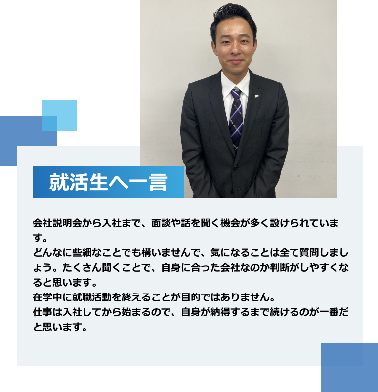 この会社を志望する人に、あなたがお勧めする1番のポイントを教えてください。自分自身の意見を直属の上司がきちんと反映して下さる事です。意見をきちんと反映して下さるので、こちら側としても意見を伝えようという気持ちになりますし、困った事は伝えられる環境があります。コミュニケーションを取れる環境があることは当たり前の事かもしれませんが、とても大事な事だと感じています。